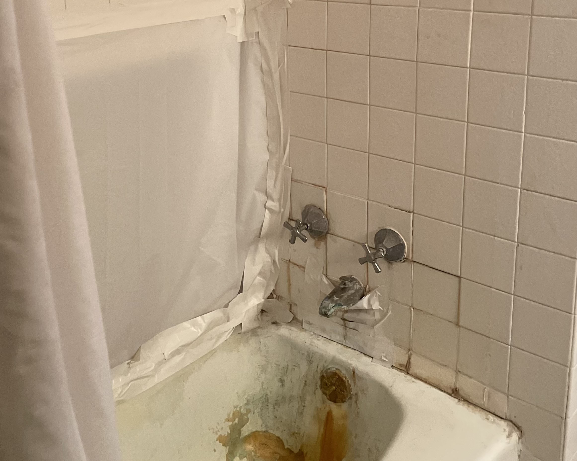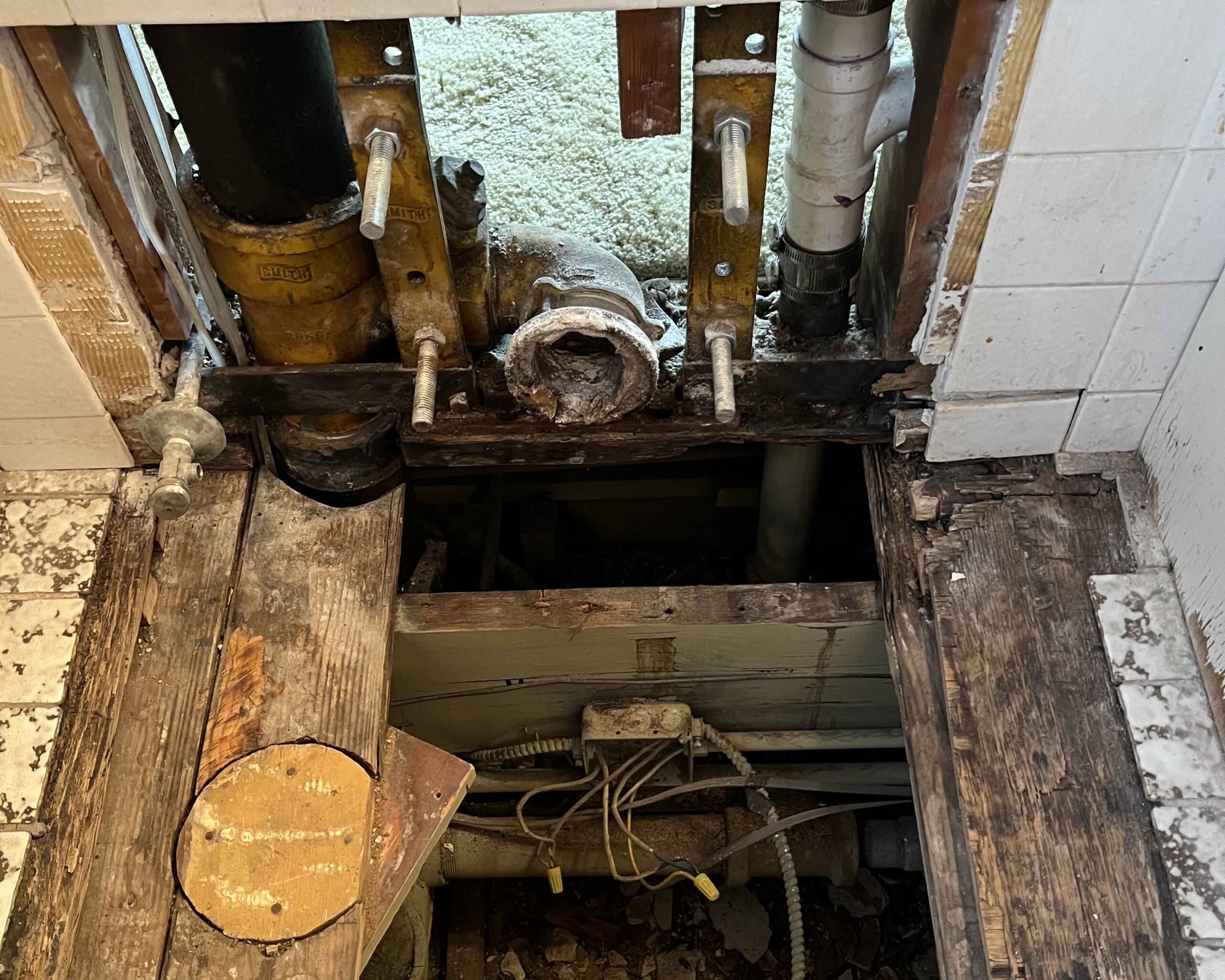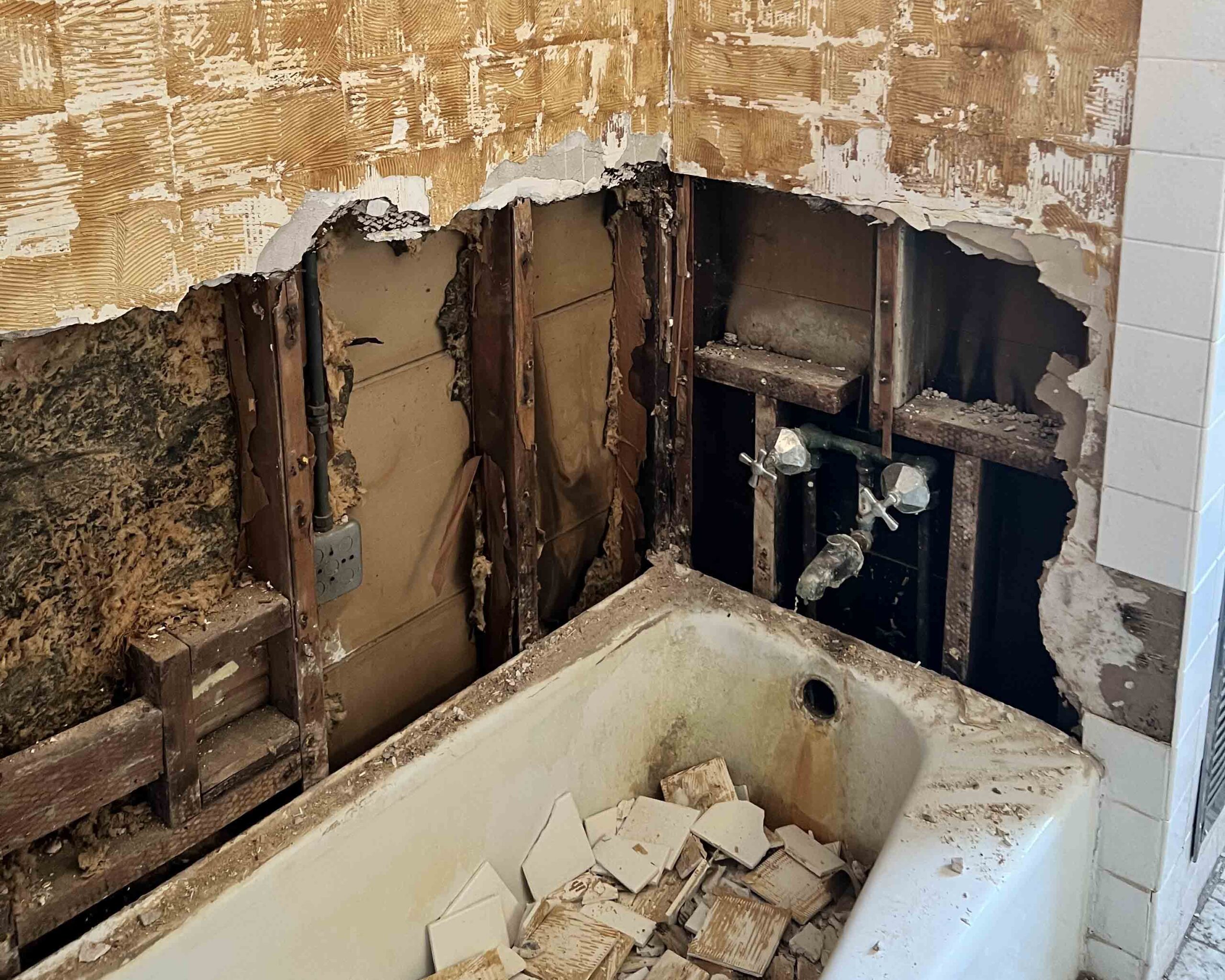 We went to a home in Barrington at the request of BACOA to check on a roof leak. It was November. What we discovered was that the homeowner had no heat and no hot water. It was November! We know a guy—we had a new valve on the boiler and heat the next day. Three days later we installed a new water heater. Then we were told the toilet didn't flush and we saw that a wall was missing in the tub/shower. Egads!