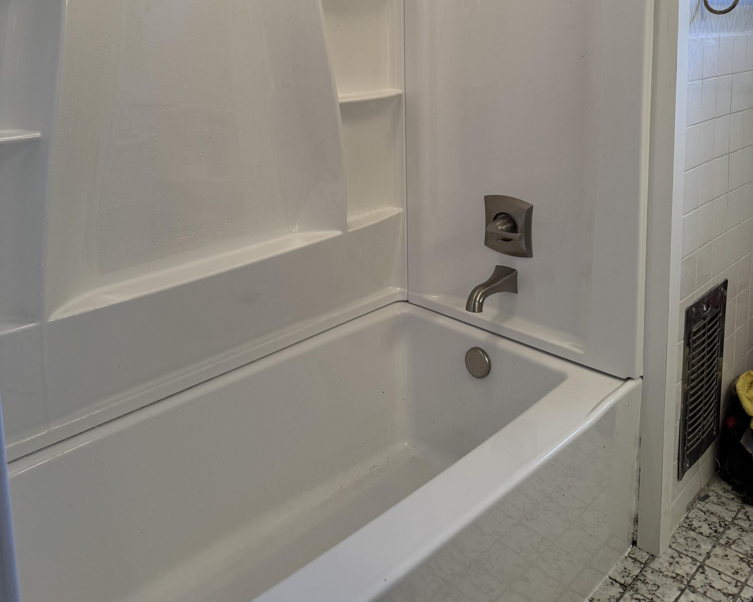 We know a different guy—got the toilet drain open. The toilet itself was leaking badly. We would have to pull it off the wall, repair the water damage and install a new toilet. Then we turned our attention to the tub/shower. Everything had to go. We gutted the alcove, redid the plumbing, and installed a new tub and shower surround complete with glass sliding doors. After the spring thaw we will finally get to the roof...why we went there in the first place. Squirrel!